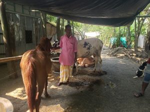 সড়কের এক পাশে পলিথিনের চাদুয়া টানিয়ে আবার ব্রীজের উপর কয়েকশ গরু,ছাগল রেখেছেন। কয়েকজন কৃষক জানান বন্যার পানিতে ঘরবাড়ী ডুবে যাওয়ায় সবাই আশ্রয় নিয়েছেন সড়কের পাশে খুপরি তুলে। বানের স্রোতে বসতঘরে সম্পূর্ণ বিধ্বস্ত হওয়া পরিবার গুলো সড়কে আশ্রয় নিয়ে মানবের দিনযাপন করছেন। এ ছাড়া কোন কোন পরিবারের ঘরে থাকার মত পরিবেশ হলেও গবাদিপশু নিয়ে বিপাকে। পানিতে পচে গেছে সব গোখাদ্য। নিজেরা টেনেটুনে দিনে একবেলা খেতে পারলেও পশুগুলোর মুখে তুলে দিতে পারছেন না কিছুই। পথের দুই ধারে বিভিন্ন স্থানে গবাদিপশু বেঁধে রাখতে দেখা গেছে। পাশের গ্রামগুলোতে এখনো বন্যার পানি আছে। তাই মানুষ যেমন ঘরে ফিরতে পারছেন না। নেই গবাদিপশু চরানোর জায়গাও।